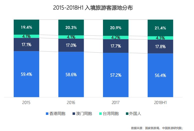 ここ数年間におけるインバウンド旅行客の構造を見ると、香港・マカオ・台湾の旅行客が占める割合が低下したものの、外国人旅行客の比率はなお伸び続けており、国外から中国大陸へのインバウンド旅行客の構造バランスは改善されてきています。