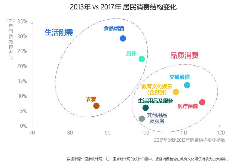 2017年は、衣食住に代表される生活消費の所得に占める割合が全体的に低下した一方、教育文化娯楽(旅行を含む)、交通通信、医療保健、生活用品や生活サービスに代表される「生活の質」に関わる消費が増加しています。